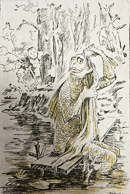 Б. Альменов, вероятно, делал предварительные эскизы к сказке, один из которых можно встретить в сборнике произведений Г. Тукая 1958 года (рис. 4), где заметно, что художник также работал и с более антропоморфным образом Су анасы в черно-белой гамме. Подобное прочтение облика воспринимается более пугающим, поэтому мастер впоследствии сосредоточился именно на зооморфных чертах существа (рис. 5).