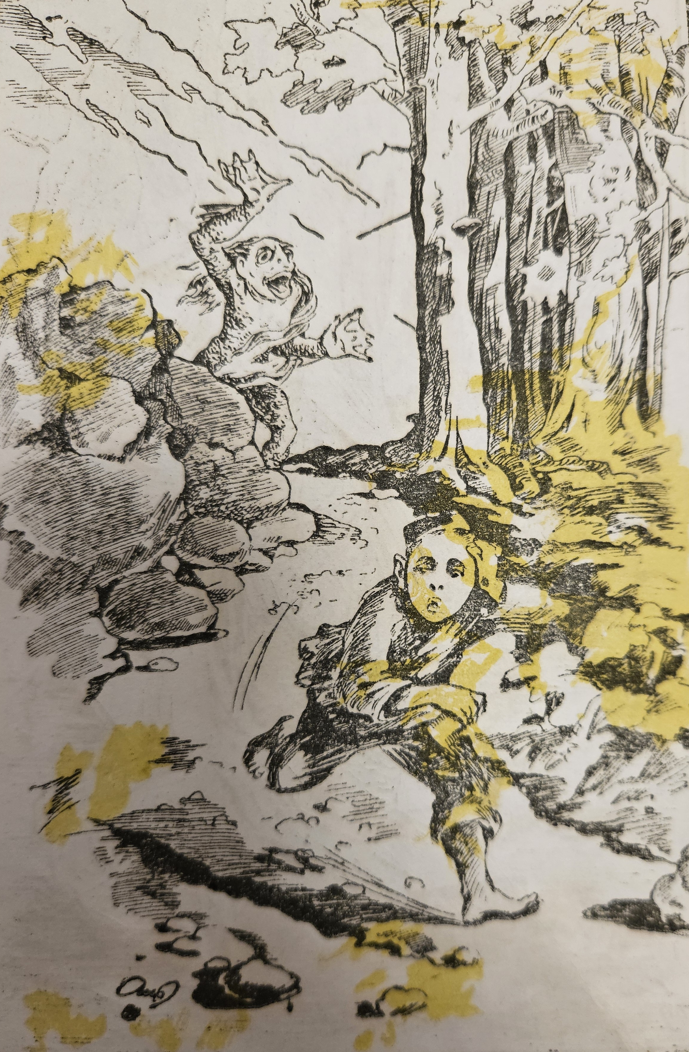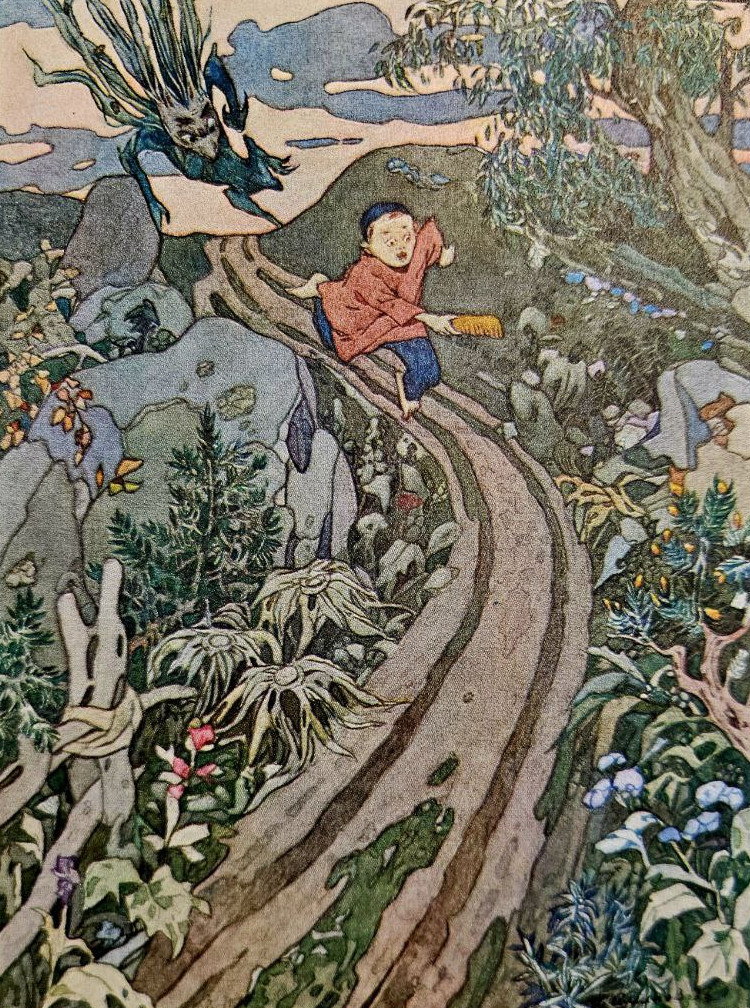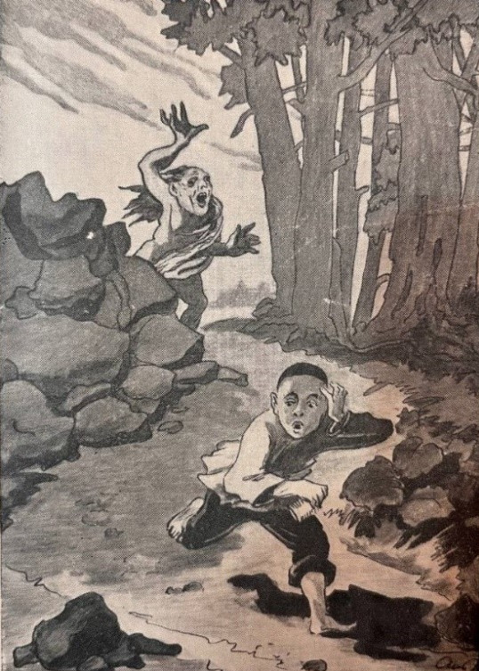 На следующей иллюстрации изображена сцена погони. На переднем плане, в левом углу, мальчик с гребнем в руке убегает от водяного духа. Ребенок буквально летит: его правая стопа едва касается земли, а тело устремлено вперед. Подобным образом изображена и сама Су анасы. Ее лицо напоминает маску демона Онрё (мстительный дух в виде женщины, чье лицо выражает экстремальные по своему накалу эмоции: ревность, ярость, злобу, отчаяние) из японского театра Но: гиперболизированные черты, искаженные яростью, широкий оскал. В этой сцене отчетливо проявляется сверхъестественная натура описываемого существа: безумное лицо, тело, скрытое волосами, и невероятная скорость, позволяющая догонять проворного деревенского мальчика.