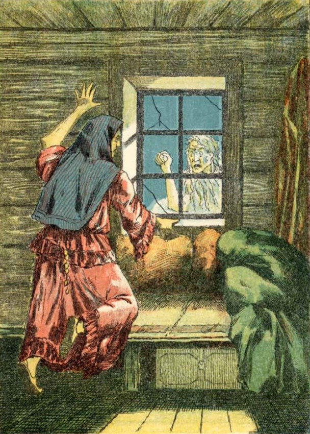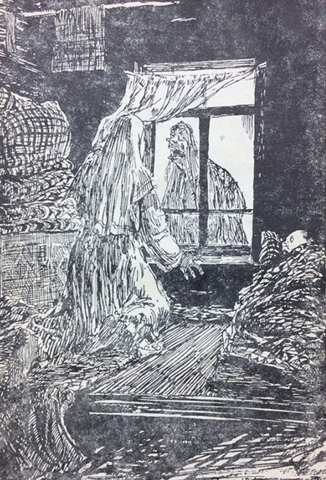 В иллюстрациях 1970-х годов Ф. Аминов красочно изображает мир чарующей природы, на фоне которой образ Су анасы кажется особенно устрашающим [Тукай, 1978] (рис. 9). Она напоминает ведьму или даже Бабу-Ягу – обнаженное тело с острыми позвонками, черные глаза, большой острый нос, длинные взлохмаченные волосы, как в иллюстрациях И. Билибина к сказке «Василиса прекрасная» [Василиса прекрасная, 1907, с. 6] (рис. 10-11). В целом, этот образ Су анасы наиболее близок к иллюстрациям 1908 года, поскольку здесь также обыгрывается облик ужасающей старухи, но с большим уклоном на хтонические черты.