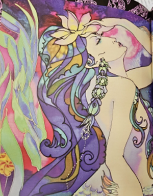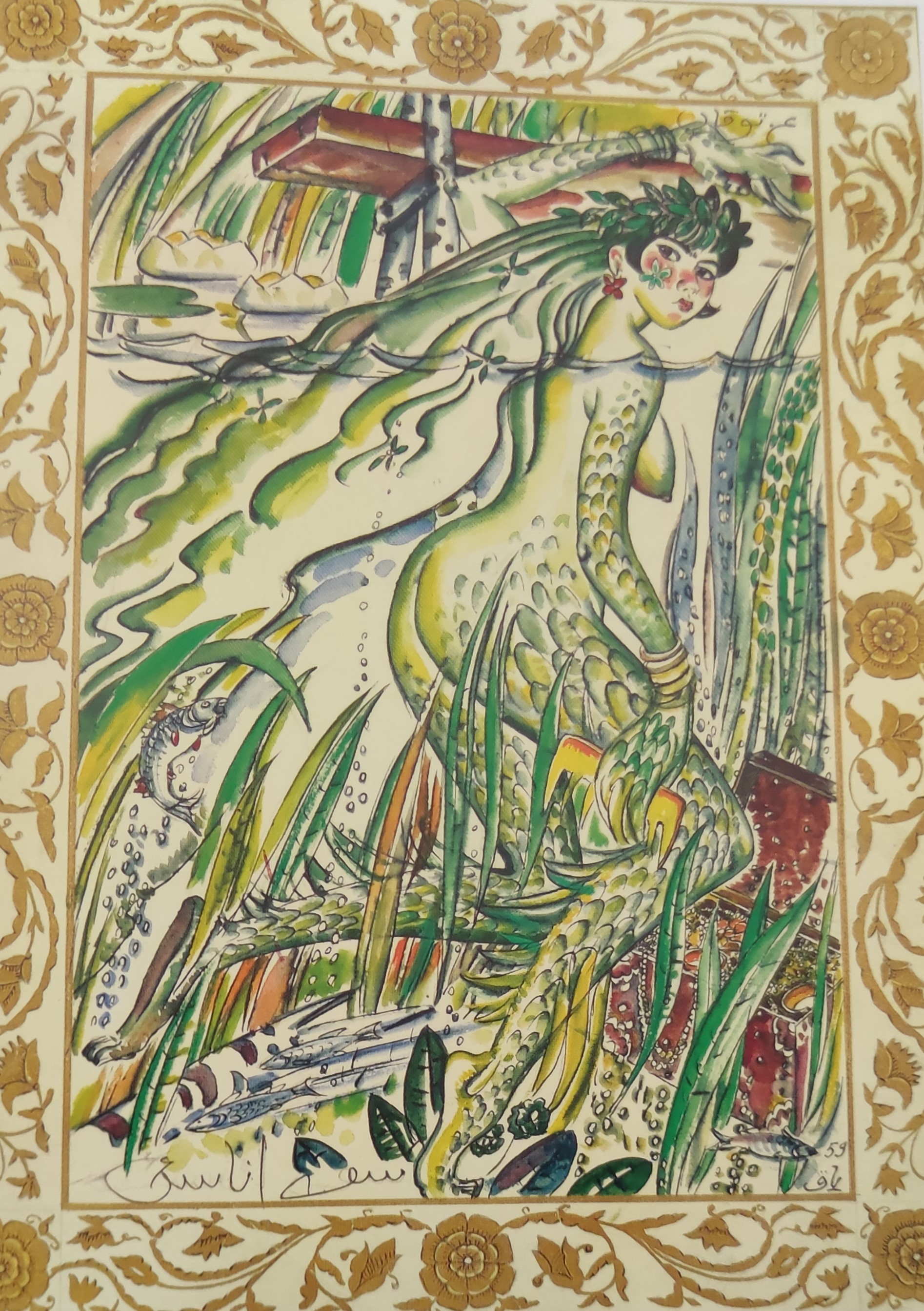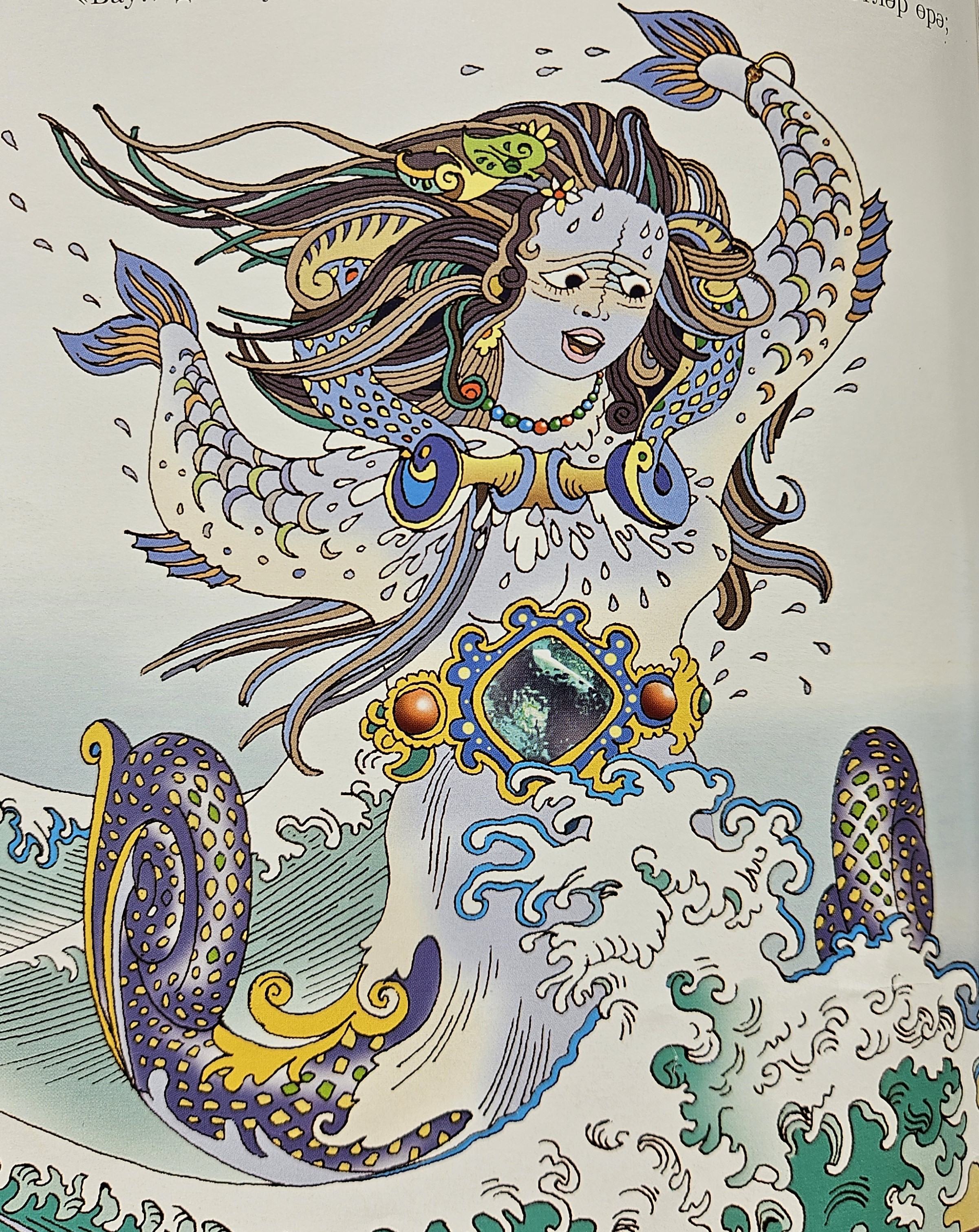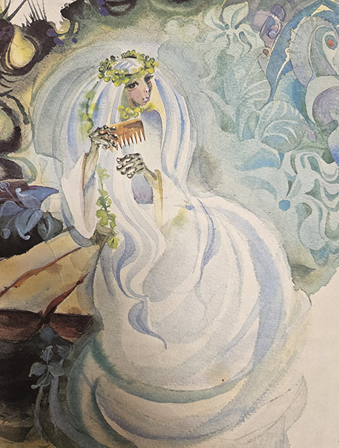 Образ женщины-амфибии встречается в диафильме 1980-х годов иллюстрациях В. Карамышева [Тукай, 1985] (рис. 12), в графике Г. Эйдинова («Су анасы» в серии линогравюр «Мир татарской сказки», 1987), однако акцент смещается в сторону большей привлекательности. Персонаж становится менее эмоциональным (чаще представлено безмятежное состояние), женственные черты подчеркиваются за счет макияжа, персонажа одевают в свободное платье, чей внешний вид имитирует движение воды или сверкающую рыбью чешую, а на голове появляются различные украшения из цветов.