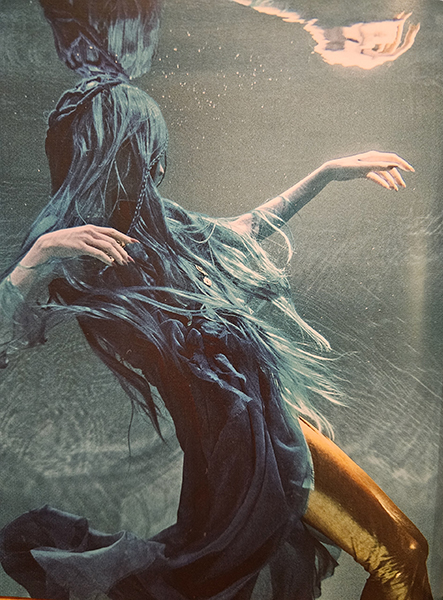 В 2021 году Т. Лепп издала книгу «Замечаю волшебство», в котором публикует свой фотопроект к татарским народным сказкам, среди которых есть «Су анасы» («Водяная») [Лепп, 2021] (рис. 26). Художница приводит татарскую народную сказку про Су анасы и мельника, где дается подробное описание пугающего облика духа воды (по Я. Коблову). Но Т. Лепп отказывается от этой иконографии: «мне же всегда казалось, что она дух воды, и потому должна быть красивой» [там же, с. 18]. Она пригласила на роль профессиональную модель К. Сом, которая умеет «задерживать дыхание, плавать и даже красиво тонуть» [там же, с. 18]. Практически все композиции обрезаны, акцентируя внимание на той или иной детали (золотой гребень, завораживающие глаза, украшенные блестками вокруг глаз, имитирующими чешую). Су анасы безмятежна и спокойна, даже в кадре с движением пластика ее тела напоминает прекрасную русалку. Подобное прочтение облика встречается в короткометражном фильме «Юха» («Юха», 2021, реж. Т. Черногузова). В 2024 году в книге «Мифические существа татар», в которой Р. Нагаева изобразила Су анасы в виде черноволосой красавицы с белой кожей, тонкими изящными чертами лица (причем глаза запечатлены на фоне чешуи) – все в ней дышит безмятежностью и спокойствием [Нагаева, Ерохина, 2024] (рис. 27).